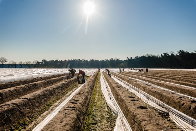 La gente consume espárrago verde todo el año y es versátil. Aparece cada vez más en ensaladas, por ejemplo. Aunque se puedan importar espárragos blancos de Sudamérica o Sudáfrica fuera de la temporada neerlandesa, los consumidores los asocian con la primavera. Eso está bien; mantiene la estacionalidad. Los blancos están disponibles durante cuatro o cinco meses, desde finales de enero (invernadero) hasta finales de junio (campo abierto).