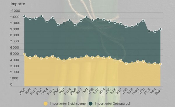 A pesar de este crecimiento, la producción nacional aún no cubre la demanda. En 2024, Suiza importó cerca de 3.600 toneladas de espárragos blancos y unas 5.700 toneladas de espárragos verdes. En total, el consumo de espárragos – tanto blancos como verdes – alcanza casi 1 kilo por habitante.