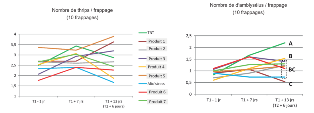 Conclusión: El producto ALTO’STRESS® y el producto 4 aportan las mejores eficacias, respetando al mismo tiempo al auxiliar del género Amblyseius.