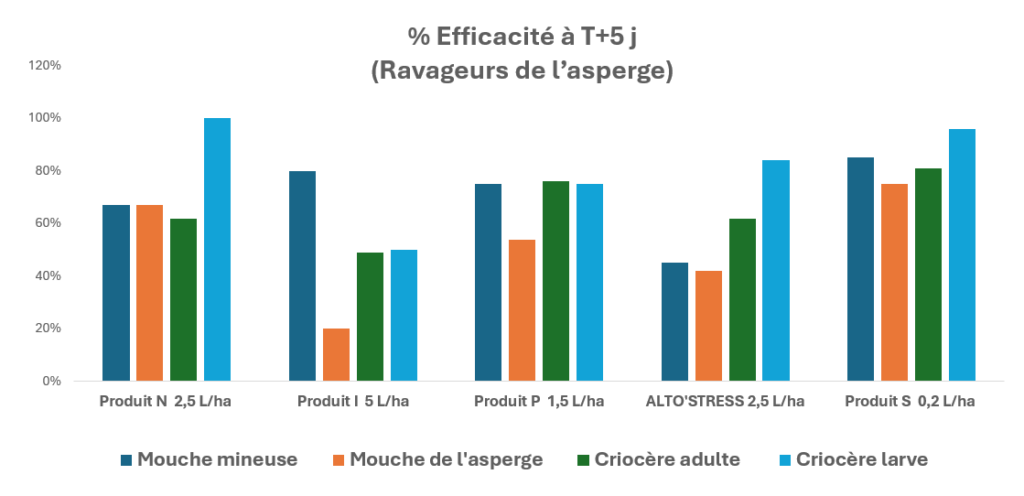 Conclusión: Ninguna de las soluciones alternativas y ecológicas alcanza el 100 % de eficacia, resultado que normalmente solo se obtiene con insecticidas convencionales como el utilizado como referencia (Producto R) en este ensayo. No obstante, estos resultados confirman un nivel global de protección muy aceptable para la solución ALTO’STRESS® propuesta por GETADE ENVIRONNEMENT. Las larvas de crioceros son las mejor controladas, mientras que las moscas del espárrago lo son en menor medida.